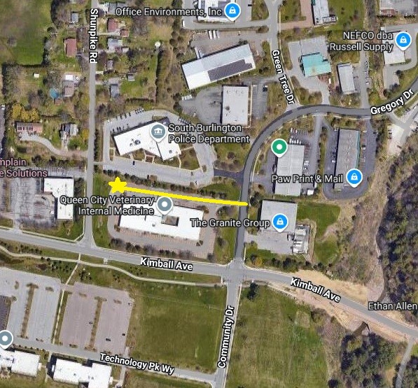 We are located right next to the South Burlington Police Department. Please note on their sign is a subtext that states “Vet Center” this refers to the Veteran Center not a veterinary practice. Please proceed to the next driveway (see below). Once in our driveway, drive straight. You will go past a large HVAC unit surrounded by a green fence, then past a line of cars in front of a white fence. The entrance to our office is at the corner of the building. We share space with Veterinary Surgery of Vermont, so you will see signs on the door for both businesses